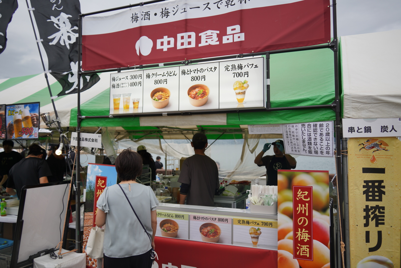 扇ヶ浜会場では、田辺市の特産品や地元飲食店による「物産テント市」が催され、紀州南高梅を使ったメニューのほか、田辺の魅力が詰まった商品が並び、多くの来場者で賑わいました。